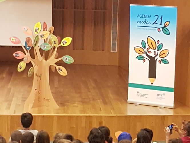 Un cop acabats els tallers, els alumnes més grans vam anar uns al Centre Cívic les Tovalloles i uns altres al col·legi Verge de la Salut. Allà van fer l’intercanvi d’experiències organitzant una fira de pòsters. Cada escola explicava a la resta quina/es accions havien dut a terme als seus centres. I per a comprovar si ens havíem xopat bé amb tota la informació, vam participar en un kahoot (joc de preguntes a resoldre per equips des del mòbil). Alhora, allà a la Salut, un alumne de cada grup de primària es va reunir per preparar la cloenda, que sempre té lloc davant d’alguns representants de l’Ajuntament.